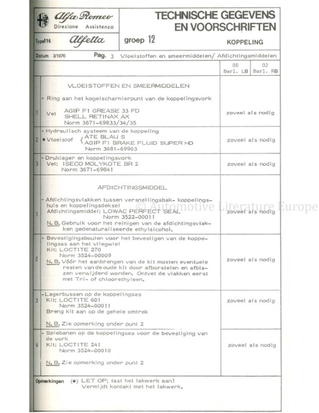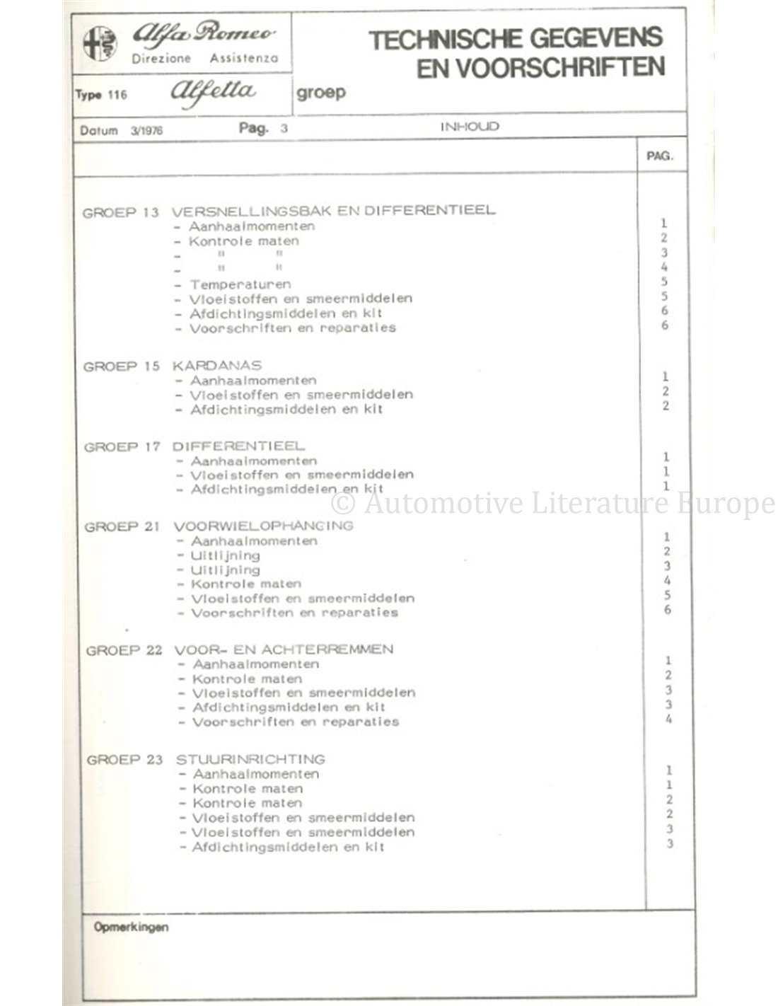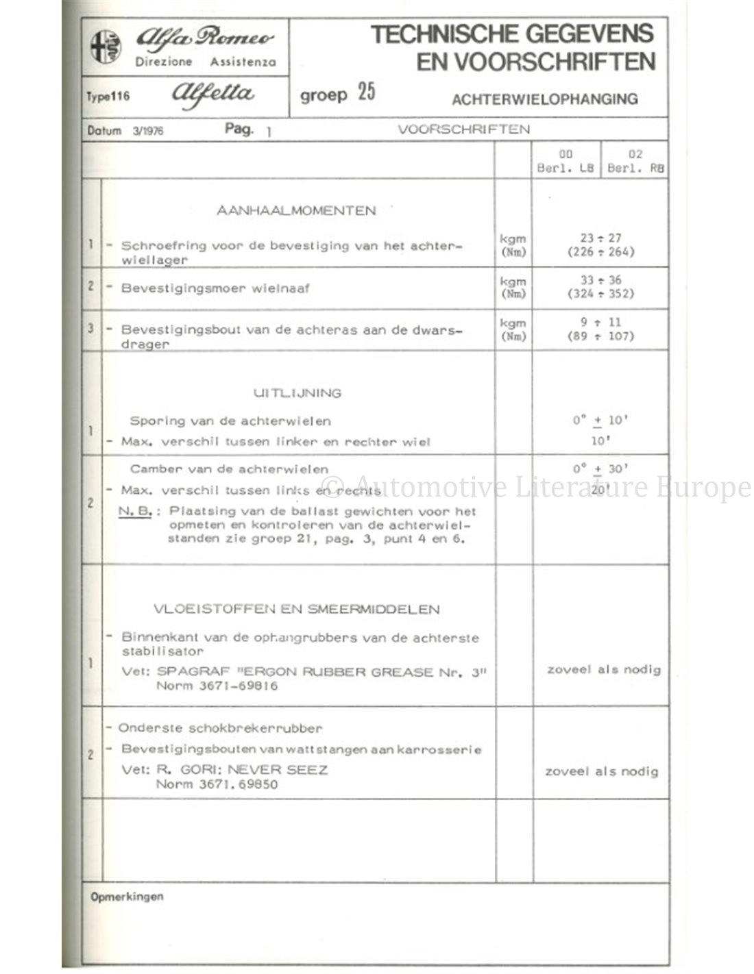 1976 ALFA ROMEO ALFETTA 1.6 TECHNISCHE DATEN UND VORSCHRIFTEN NIEDERLÄNDISCH