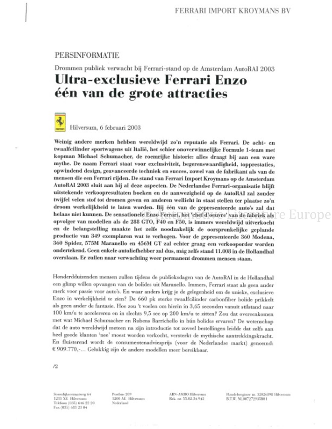 2003 FERRARI KROYMANS AUTO RAI PRESSEMAPPE NIEDERLÄNDISCH