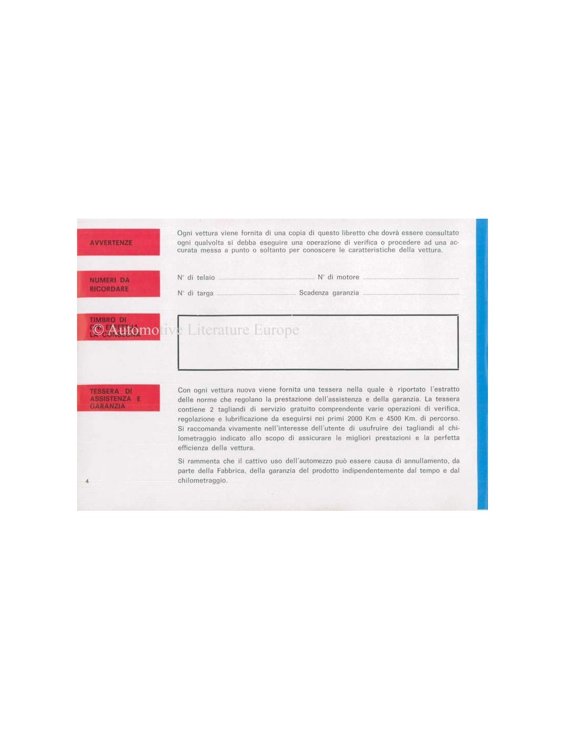 1963 FIAT ABARTH 595 OWNERS MANUAL ITALIAN