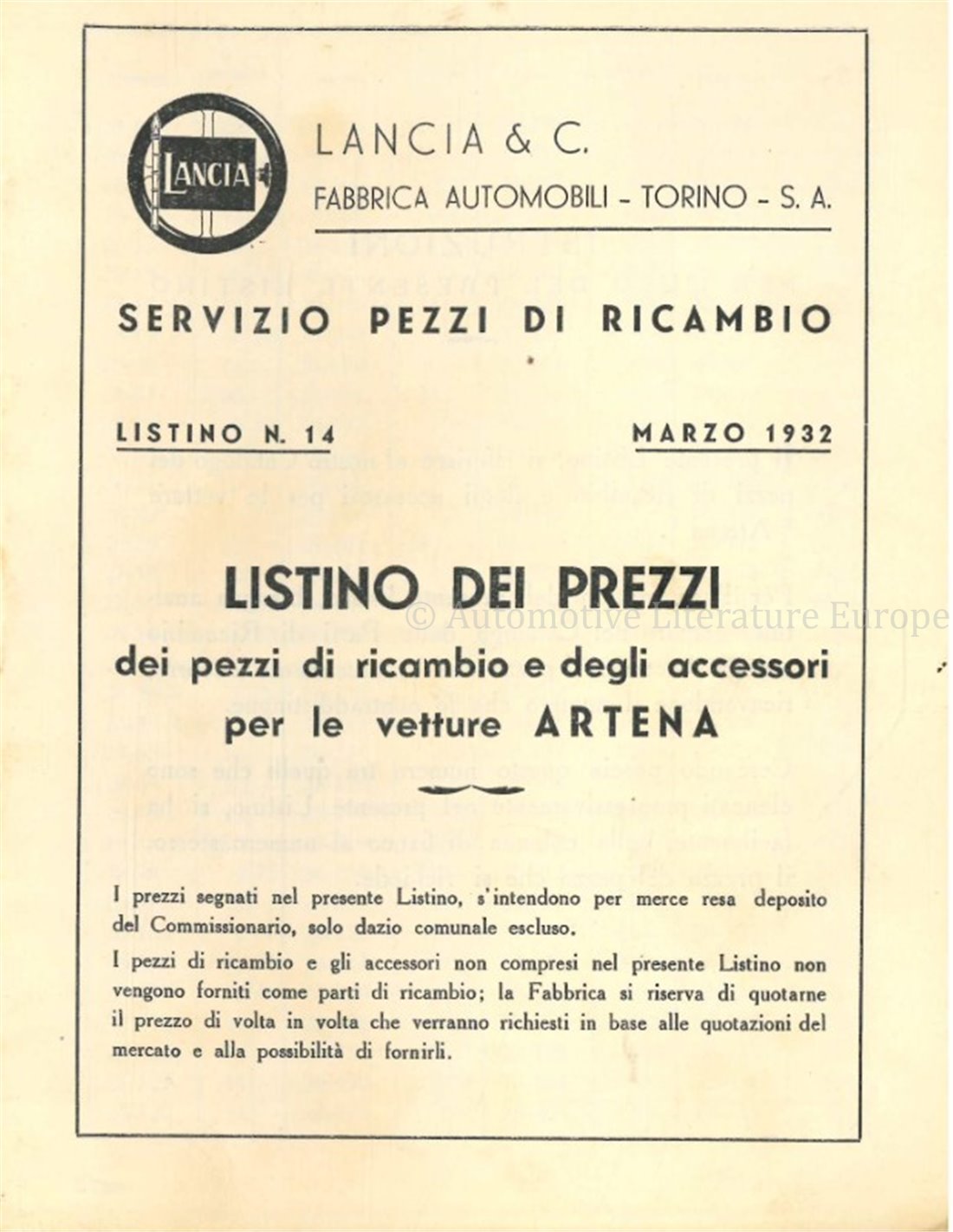 1932 LANCIA ARTENA OWNERS MANUAL & SPARE PARTS CATALOGUE ITALIAN