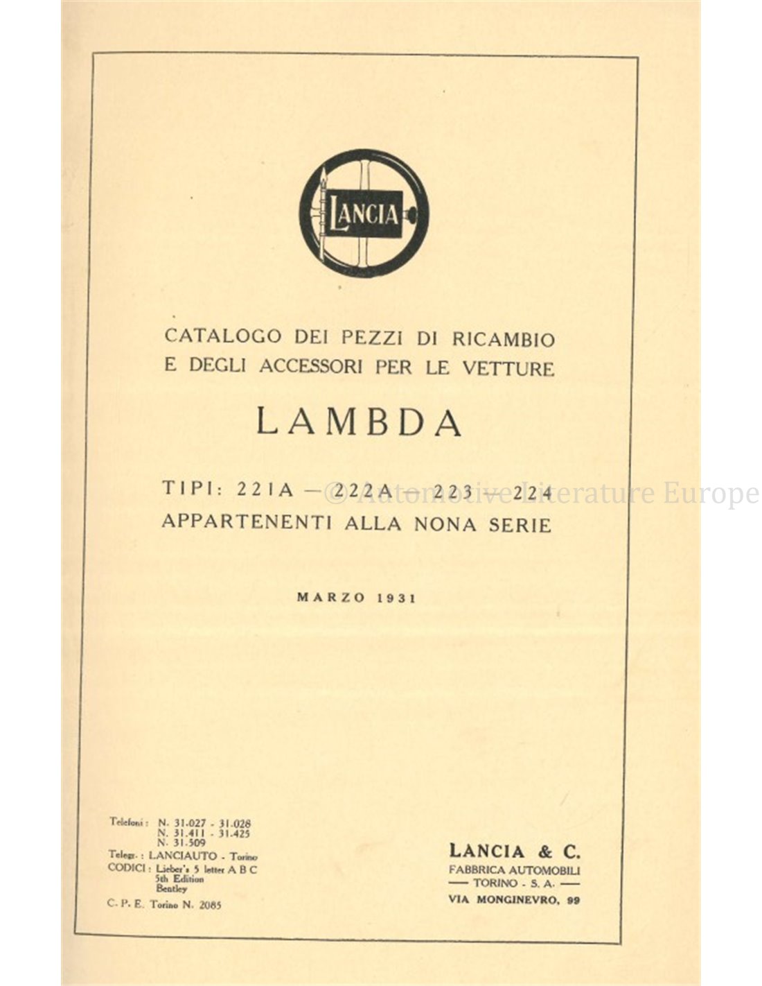 1931 LANCIA LAMBDA (SERIES IX) SPARE PART CATALOG ITALIAN