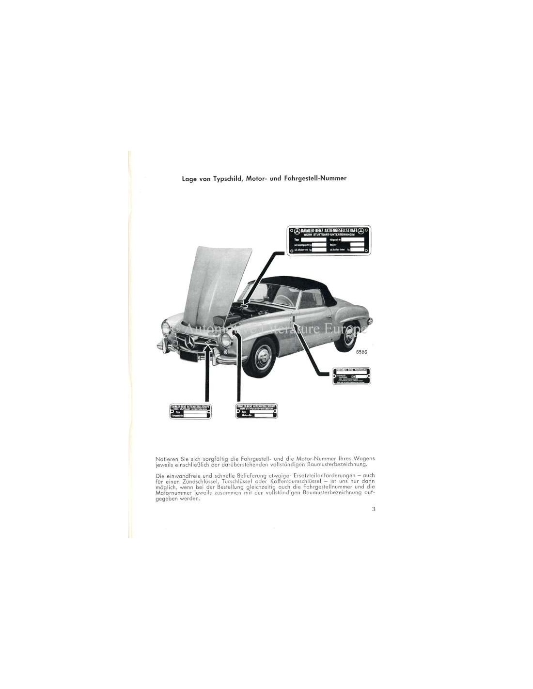 1960 MERCEDES BENZ 190 SL OWNERS MANUAL GERMAN