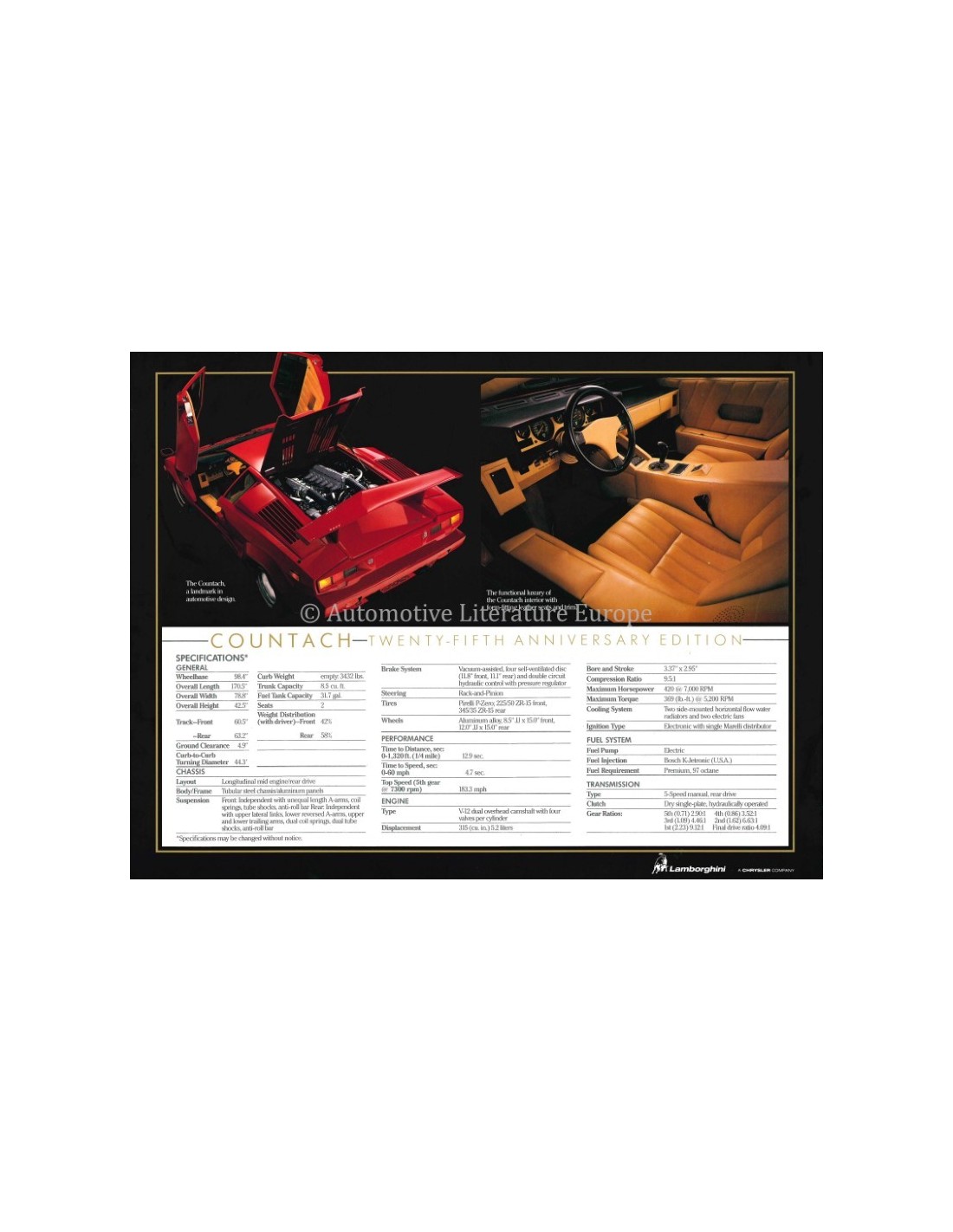1989 LAMBORGHINI COUNTACH 25TH ANNIVERSARY LEAFLET ENGELS USA
