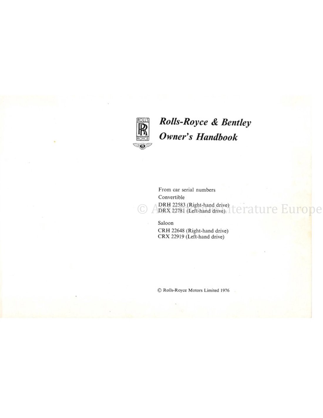 1976 ROLLS ROYCE / BENTLEY CORNICHE INSTRUCTIEBOEKJE ENGELS